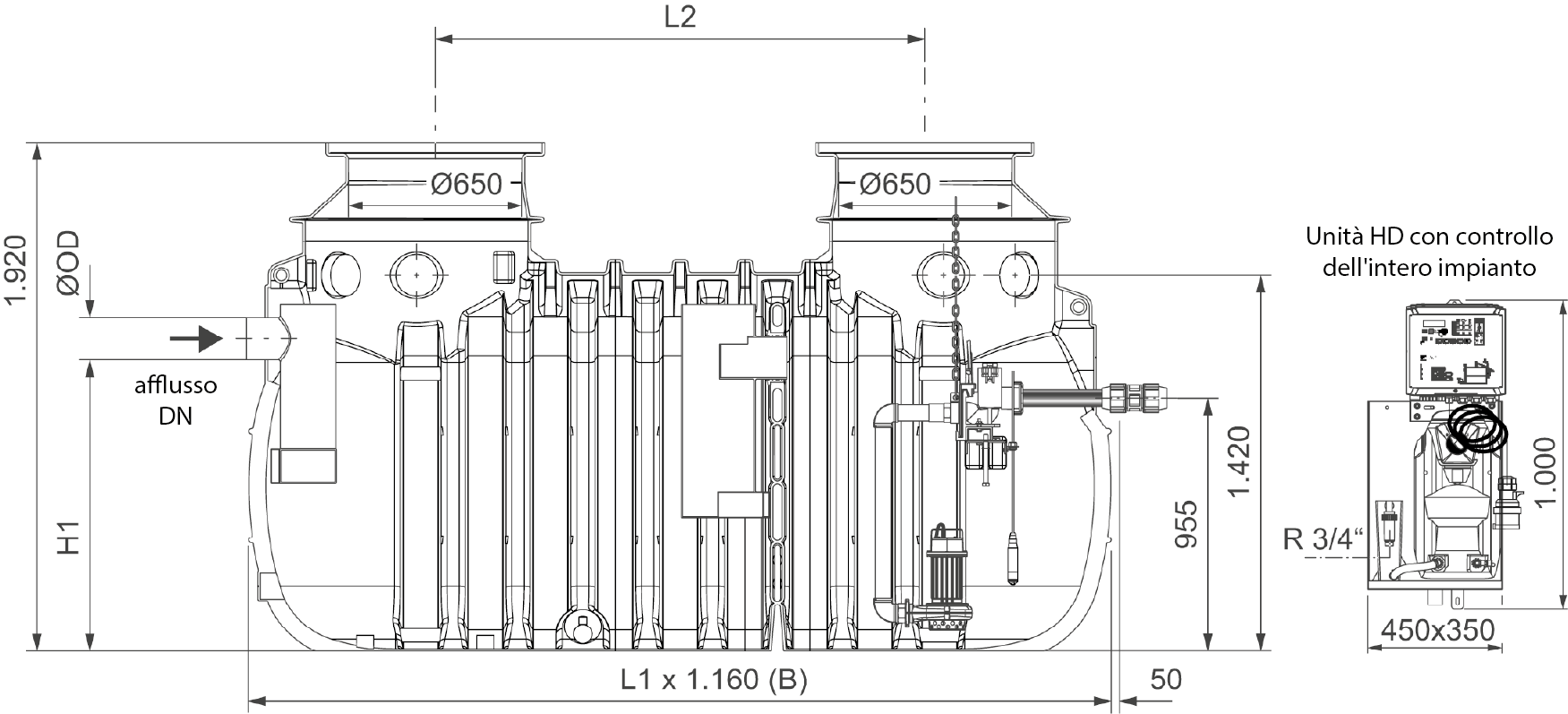 Con tubo di aspirazione in PE-HD DN 65 (∅ 75 mm) predisposto in fabbrica, con giunto Storz-B e coperchio fittizio