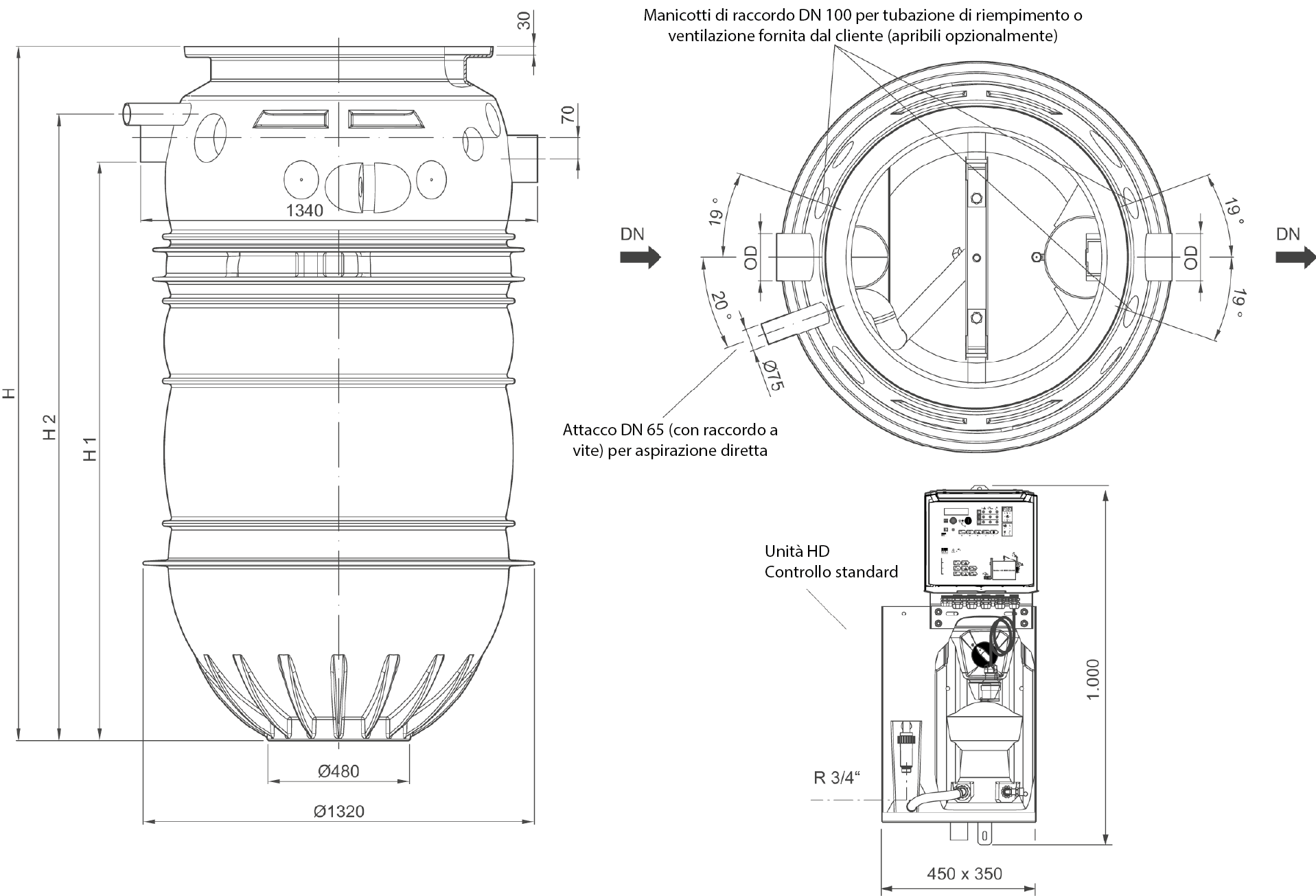 Svuotamento tramite pompa di smaltimento integrata con tubo di aspirazione DN 65 PN 10